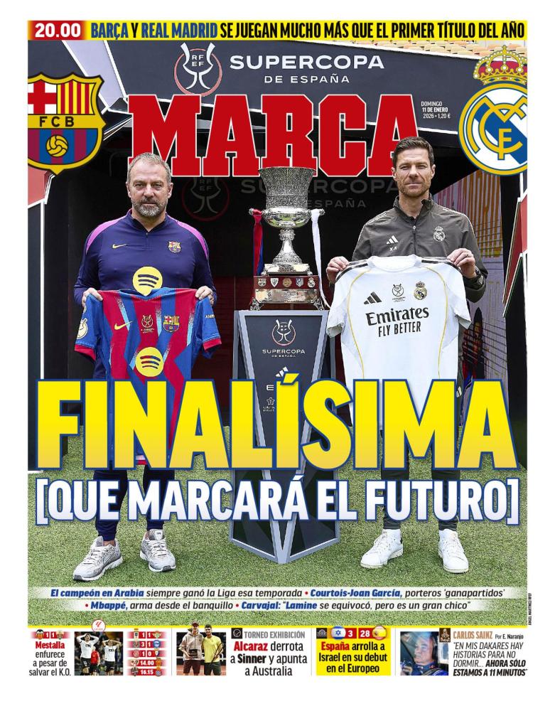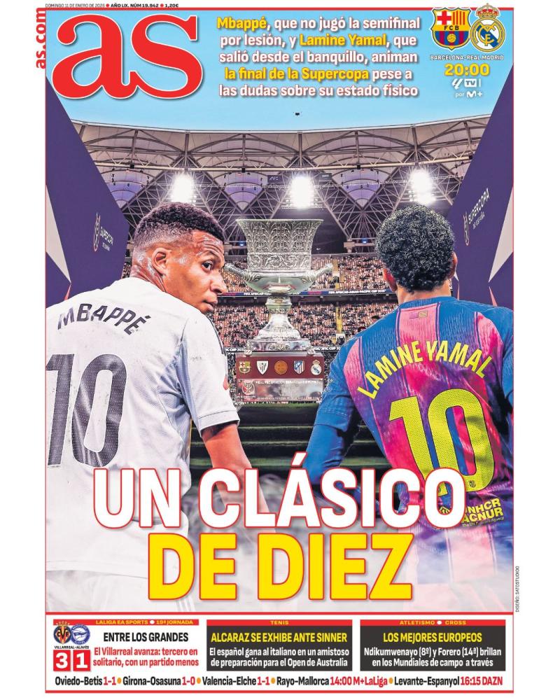 El diario AS saca en primera plana "un clásico de diez", ya que tanto Lamine Yamal como Kylian Mbappé llegarán a la final para poder jugarla. El español saldrá de inicio, mientras que el francés lo hará desde el banquillo. Así, el Real Madrid disputará una nueva final de Supercopa de España contra el Barcelona tras perder la del año pasado.