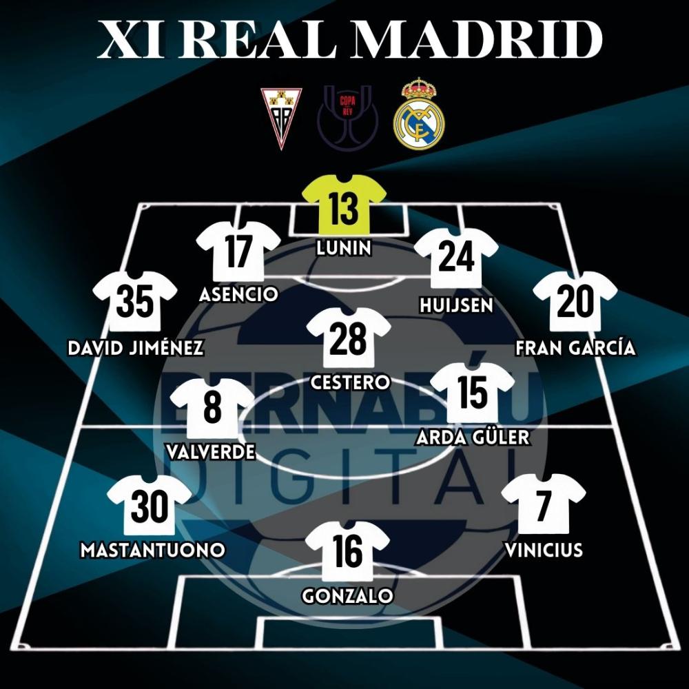 ¡Alineación confirmada en el Real Madrid! El primer once titular de Álvaro Arbeloa al frente de la nave madridista consiste en Andriy Lunin bajo palos; defensa formada por David Jiménez, Asencio, Huijsen y Fran García; centro del campo para Cestero, Fede Valverde y Arda Güler; y arriba, Vinicius, Mastantuono y Gonzalo.