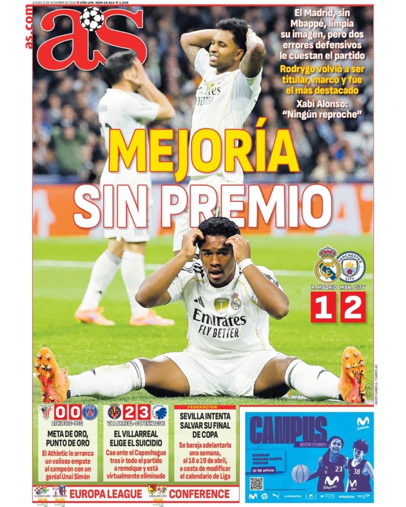 La portada del jueves del diario AS viene protagonizada por la derrota del Real Madrid contra el Manchester City.
