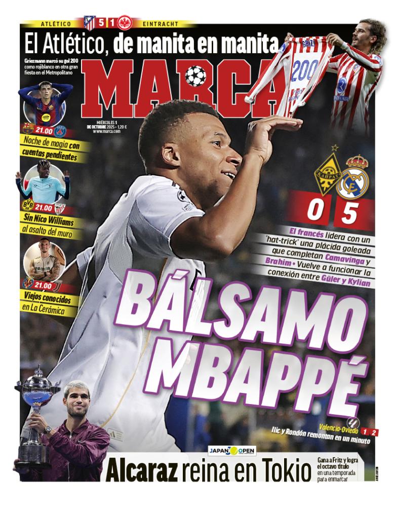 El diario Marca, en su portada para este miércoles 1 de octubre de 2025, destaca la goleada del Real Madrid al Kairat (0-5) con Kylian Mbappé como gran protagonista por su hat-trick.