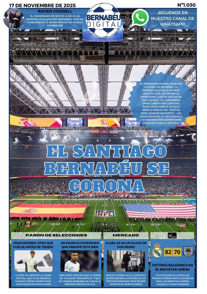 En nuestra portada del lunes 17 de noviembre de 2025, en Bernabéu Digital hemos decidido abrir con el día histórico que ha vivido el Santiago Bernabéu con la celebración del partido de la NFL en un evento que ha despertado admiración en todo el mundo.