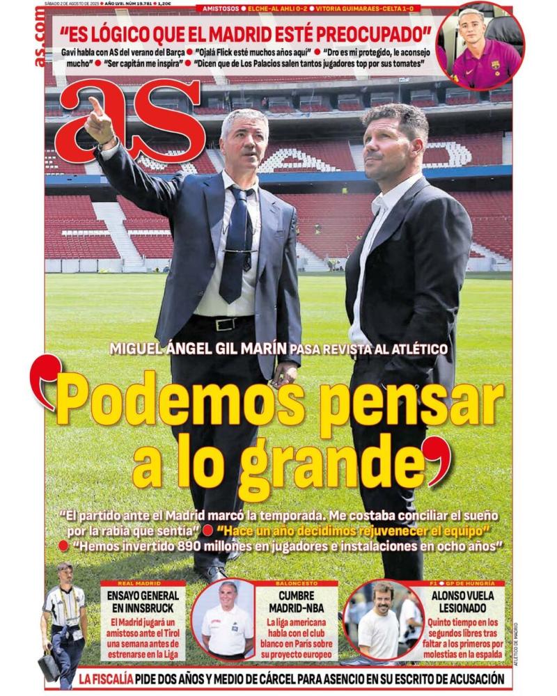 El diario AS destaca en su portada la situación del Real Madrid en pretemporada, pues jugará un amistoso en Innsbruck de preparación para afrontar el debut en LaLiga. También la reunión con la NBA para abordar una llegada a Europa el año que viene.