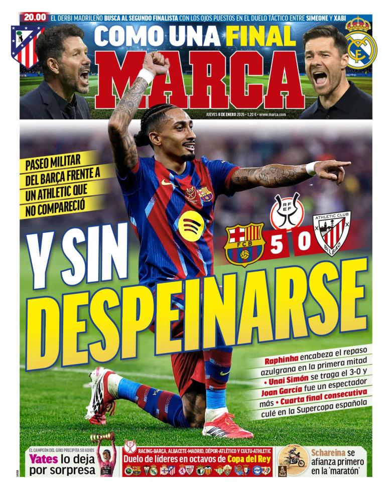 El Sport saca en primera plana la manita al Athletic en los cuartos de final de la Supercopa de España, ya que el Barcelona ha ganado fácil a los de Ernesto Valverde para llegar la final. Asimismo, destacan el derbi entre Atlético de Madrid y Real Madrid, pues esperan a uno de los dos.