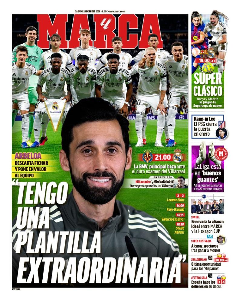 El diario Marca destaca las declaraciones de Álvaro Arbeloa, técnico del Real Madrid, sobre la "extraordinaria plantilla" que tiene, justo antes del partido ante el Villarreal en La Cerámica, que será otro duro test para los blancos.