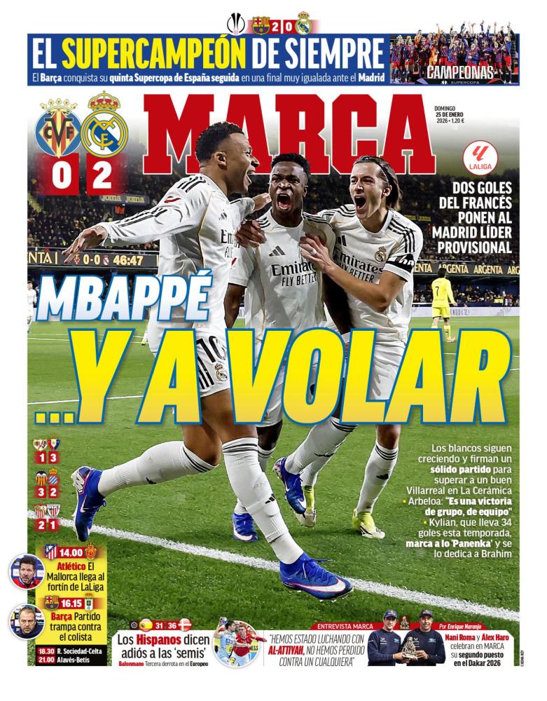 El diario Marca destaca los dos goles de Kylian Mbappé ante el Villarreal en el Estadio de La Cerámica y la victoria del Real Madrid como visitante en una visita muy complicada.