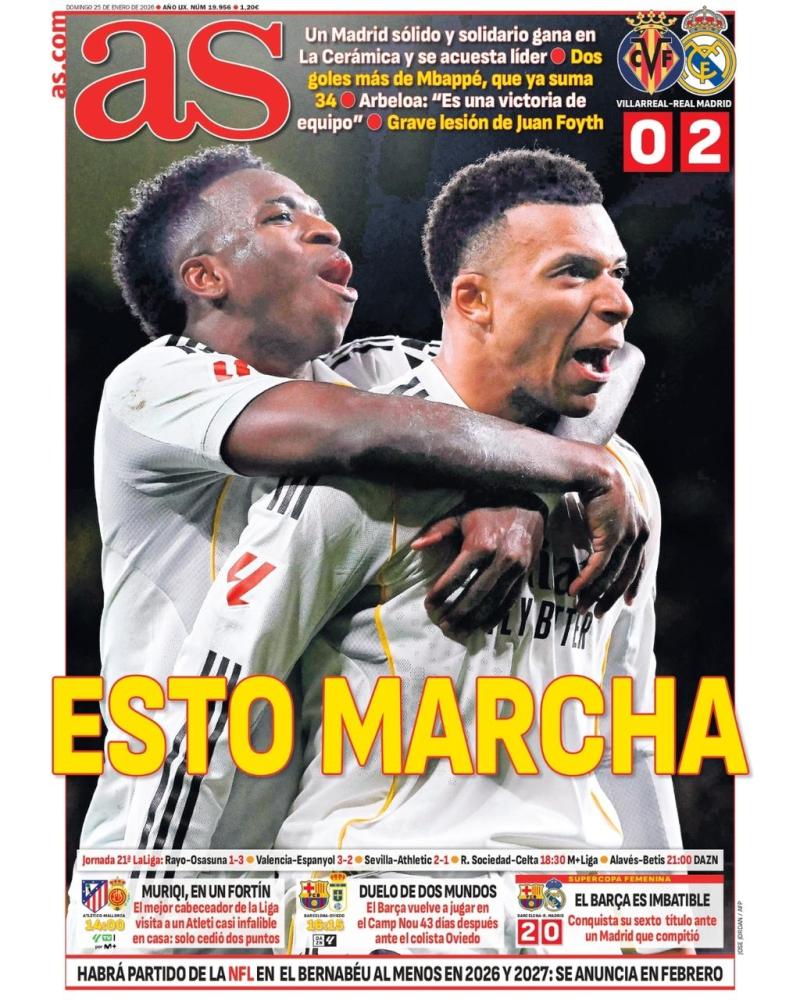 Por parte del AS, desde el diario sacan en primera plana que "esto marcha" en el Real Madrid tras la victoria del club blanco en Villarreal gracias a los dos goles de Kylian Mbappé y a dos grandes jugadas de Vinicius Jr.