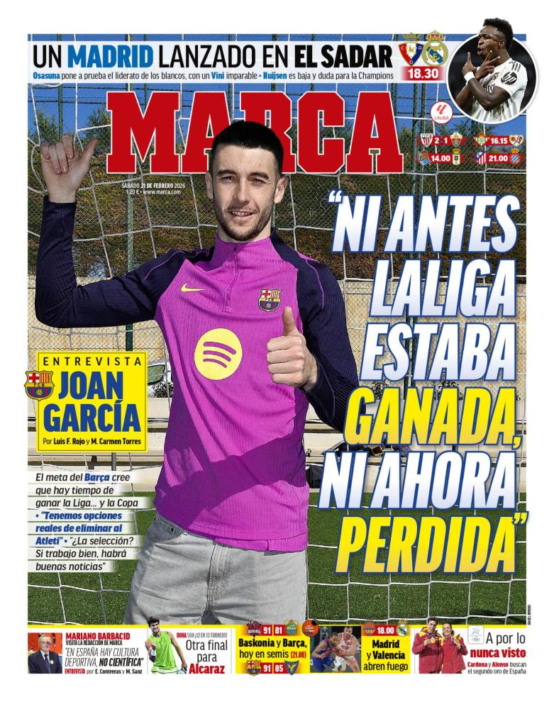 Marca destaca en su portada una entrevista a Joan García, portero culé, que ha hablado sobre la situación del Barcelona y el Real Madrid en LaLiga, sobre todo tras el cambio de liderato.