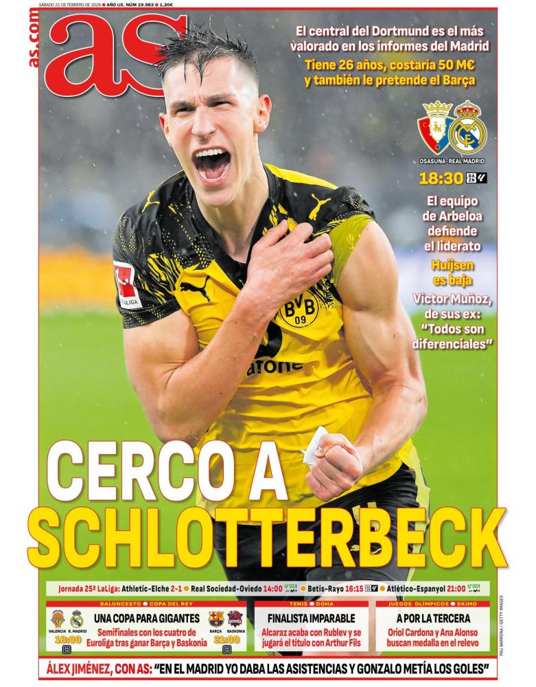 El diario AS saca en portada el interés del Real Madrid en Nico Schlotterbeck, que parece que podría materializarse en verano debido al precio que ha plantado el Borussia Dortmund: 50 millones de euros.