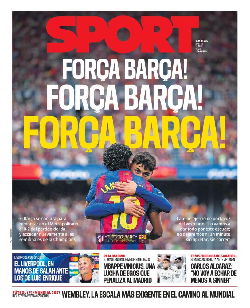 Sport pone como principal protagonista una frase de apoyo para el club al que es afín el medio donde se puede leer "força Barça", significando esto en catalán "fuerza Barça" ya que necesitarán dar todo de ellos esta noche si quieren continuar jugando en Europa.
