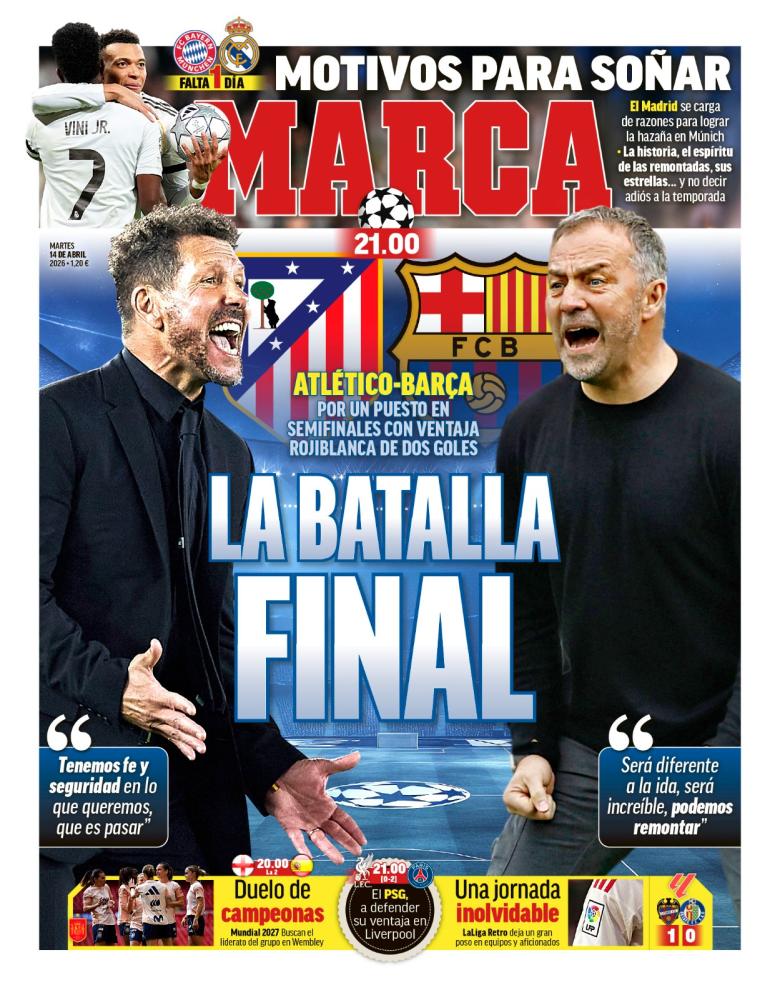 Marca destaca en su portada la épica batalla final que tendrá hoy lugar en Madrid entre el Atlético y el FC Barcelona por conseguir una plaza en semifinales de la Champions League.