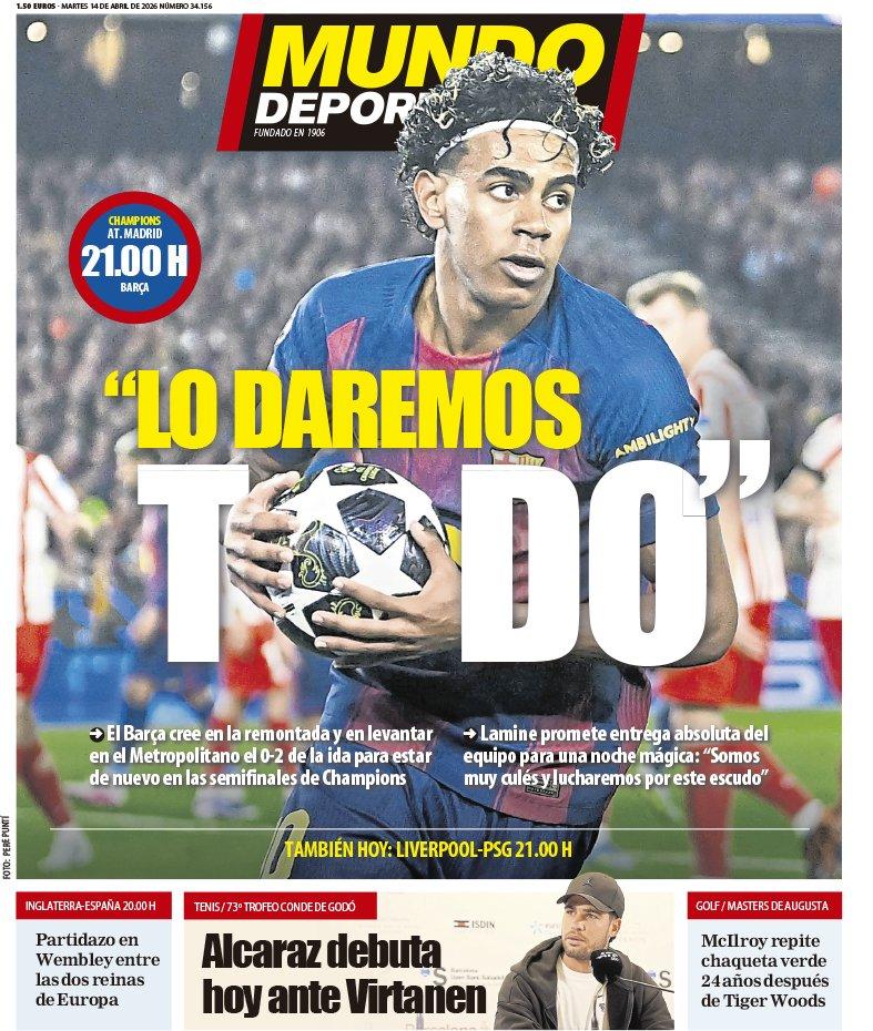 El Mundo Deportivo hace hincapié en primera página en las palabras de ayer de Lamine Yamal donde dijo: "Lo daremos todo. Somos muy culés y lucharemos por este escudo", comentó la estrella blaugrana sobre el reto que tiene su club esta noche.