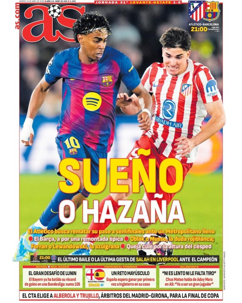 Por parte del AS, el diario saca en primera plana a Julián Álvarez y a Lamine Yamal como jugadores principales en los que se pondrá el foco esta noche en el césped del Metropolitano y que podría ser una hazaña para los culés si remontan o un sueño para los rojiblancos si consiguen pasar de ronda.