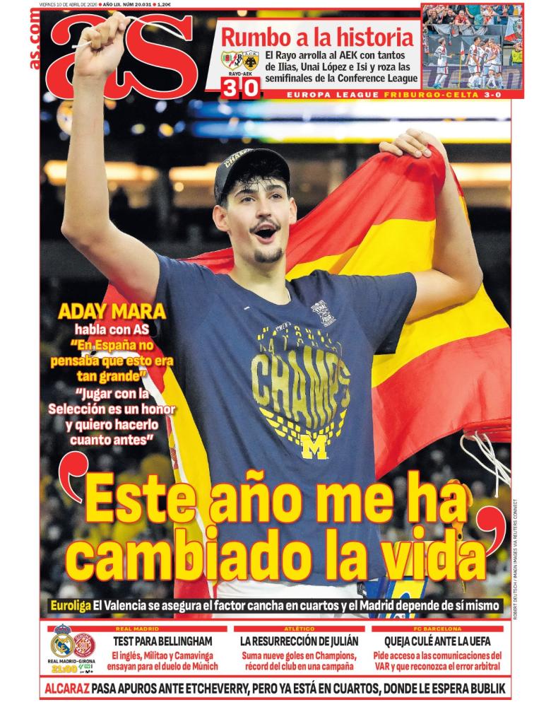 Por parte del AS, el diario saca en primera plana unas declaraciones de Aday Mara por su convocatoria con la selección española de baloncesto, jugador del Michigan Wolverines que participa en la liga NCAA de baloncesto universitario en Estados Unidos.