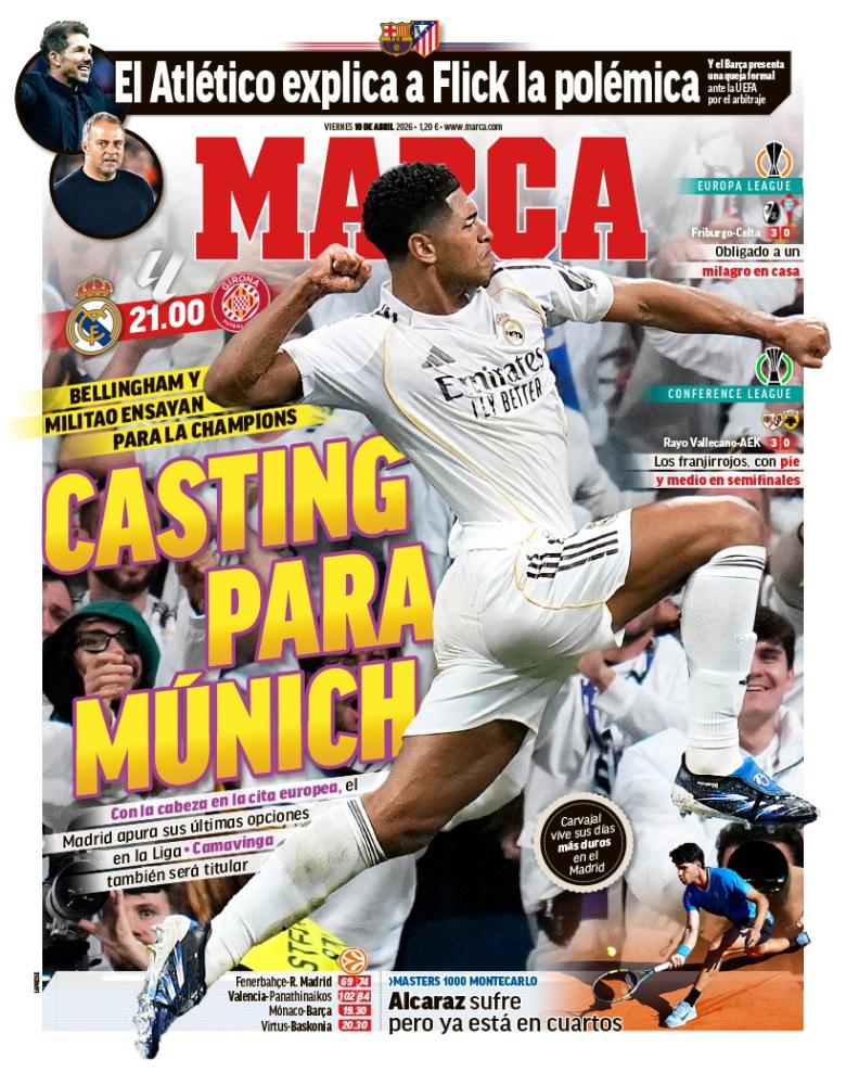 Marca destaca en su portada a Jude Bellingham como posible titular hoy frente al Girona en liga para hacer méritos de cara al importante partido del próximo miércoles contra el Bayern Munich en Champions League.