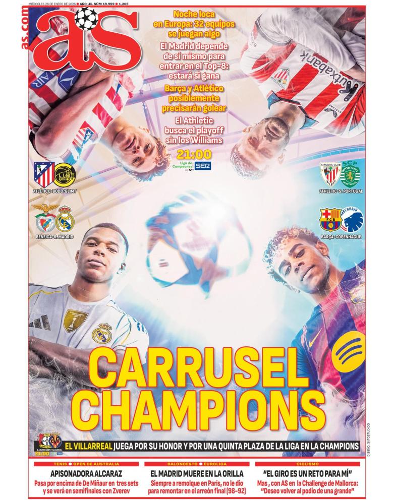 Las portadas de hoy abren con la última jornada de la fase de clasificación de la UEFA Champions League. El Real Madrid se reencuentra con José Mourinho en el encuentro ante el Benfica. En el diario AS destacan que "el Madrid depende de sí mismo para entrar en el top 8: estará si gana".