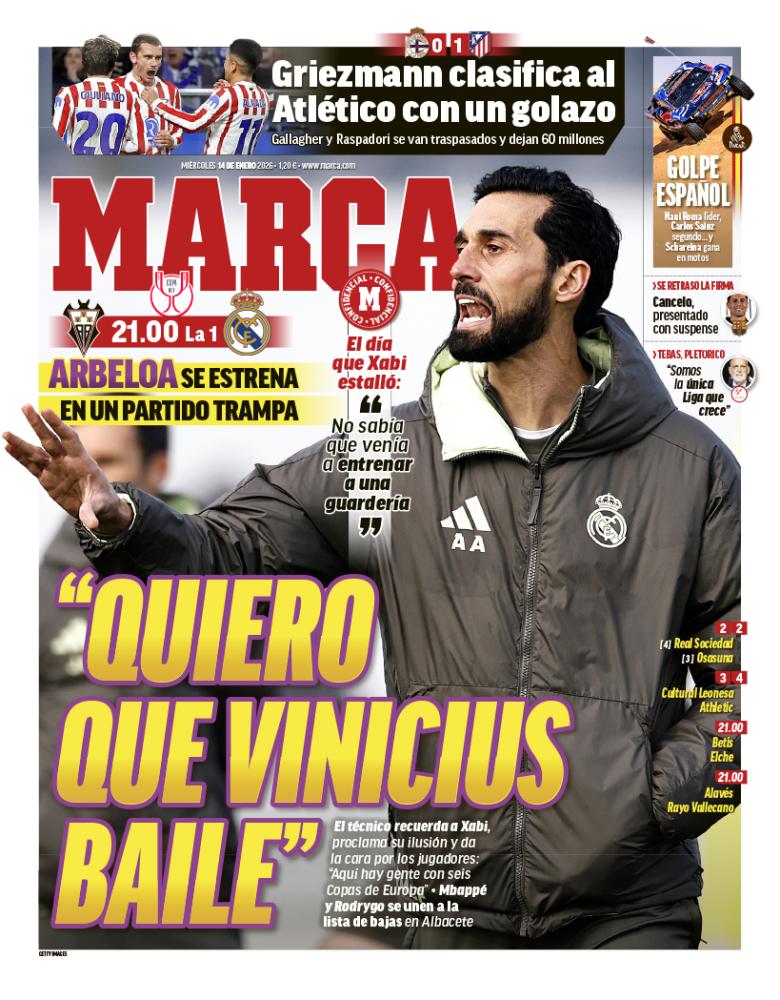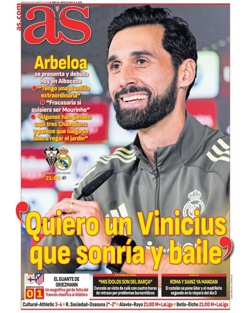¡Muy buenos días! El diario AS destaca a Álvaro Arbeloa en su presentación como nuevo entrenador del Real Madrid. El ya ex del Castilla ha querido recalcar que "quiere un Vinicius que sonría y baile", y que "fracasaría si quisiera ser Mourinho". Hoy, gran estreno con la disputa de los octavos de final de la Copa del Rey ante el Albacete.