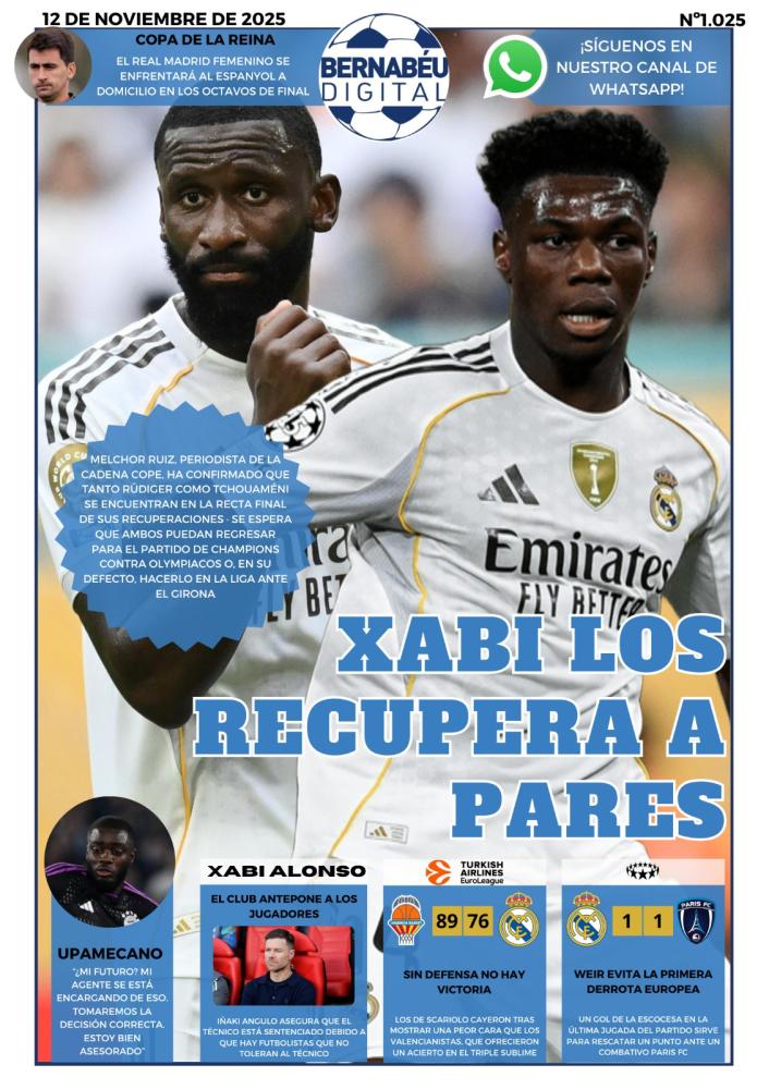 En nuestra portada del miércoles 12 de noviembre de 2025, en Bernabéu Digital hemos decidido abrir con las cada vez más próximas recuperaciones de Rüdiger y Tchouaméni.