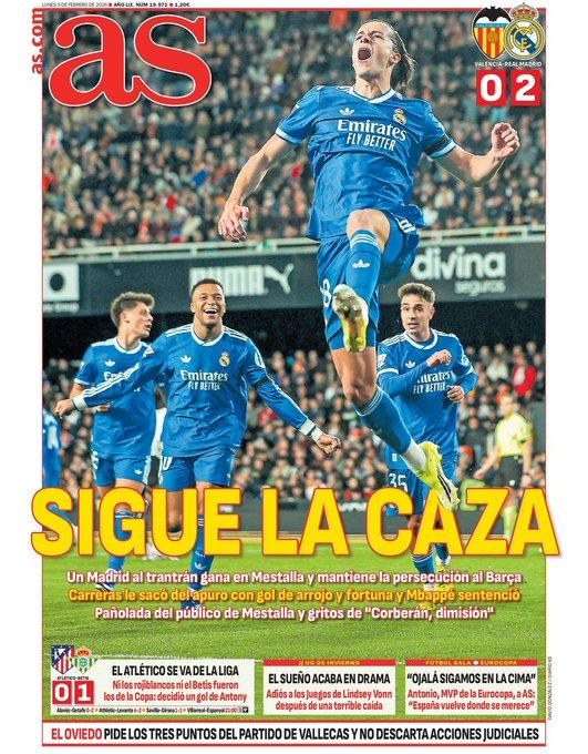 AS también deja en su primera plana el triunfo del equipo de Arbeloa, que gracias a los tres puntos en Mestalla, continúa la caza hacia el liderato que mantiene el Barcelona. Destaca a Carreras y Mbappé como protagonistas con sus goles.