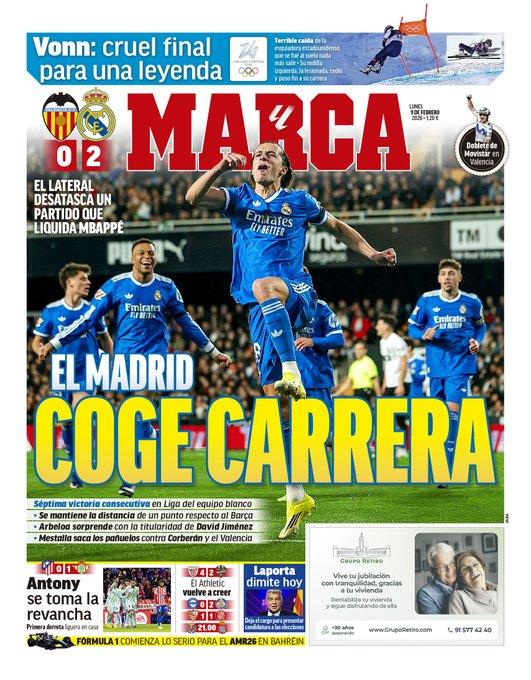 Marca ha decidido abrir su portada con la victoria del Real Madrid ante el Valencia con Carreras como protagonista. Destaca la séptima victoria seguida en Liga para no despegarse del Barcelona en la tabla.