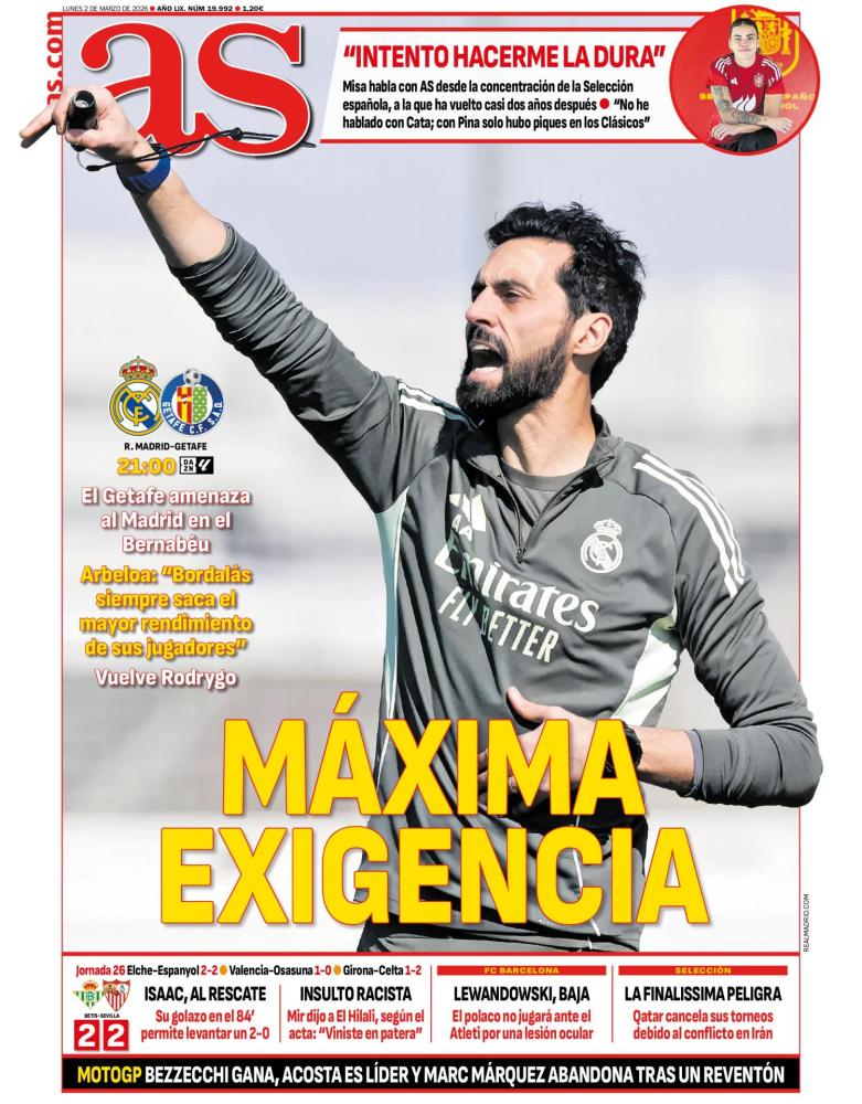 Por parte del AS, sacan en primera plana a Álvaro Arbeloa en la previa del Real Madrid - Getafe, y es que los blancos deben ganar sí o sí para poder seguir metiendo presión al Barcelona.