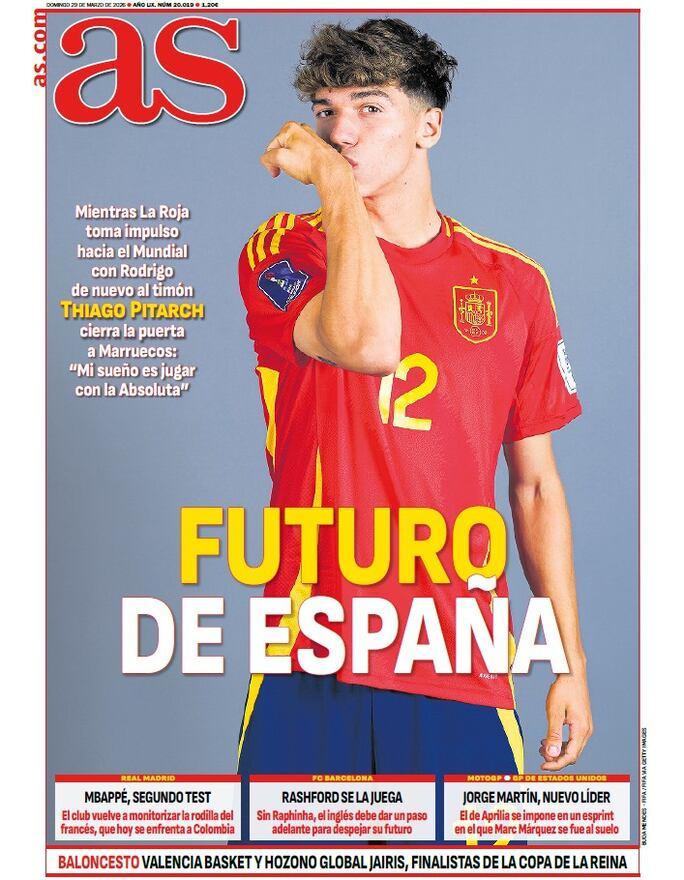Por parte del AS, el diario saca en primera plana a Thiago Pitarch, que en las últimas horas ha declarado deseo por jugar con la Selección Española.