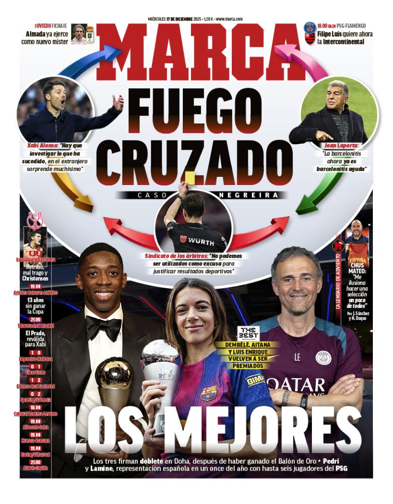 El diario Marca destaca en su portada de este miércoles el "Fuego cruzado" que se ha formado entre el Real Madrid, Joan Laporta y los árbitros dadas las últimas declaraciones de Florentino Pérez.
