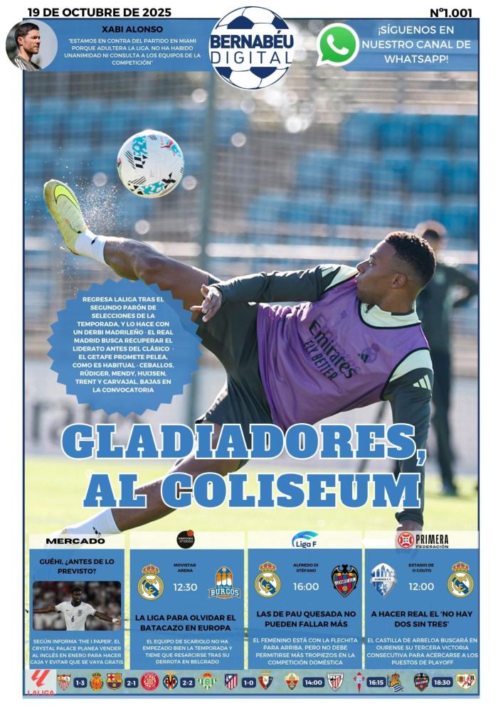 Bernabéu Digital destaca en la portada BD la previa del partido del Real Madrid contra el Getafe y las declaraciones de Xabi Alonso. También se resalta las previas del basket, del Femenino y del Castilla.