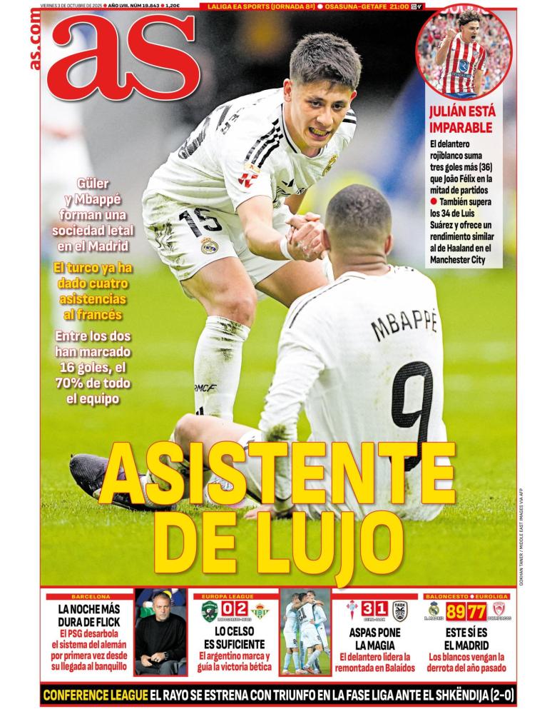 Güler, Mastantuono y Militao, entre los protagonistas de las portadas de este viernes 3 de octubre de 2025.