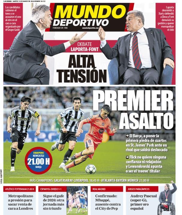 Por último, tanto Mundo Deportivo como Sport centran el foco en el Barcelona. El primero de ellos cataloga la visita de los de Flick a St James' Park como ''el primer asalto''. El segundo afirma que hay ''Ganas de Champions'' mientas critica el resultado del Espanyol contra el colista y hace apología de la campaña electoral de Laporta.