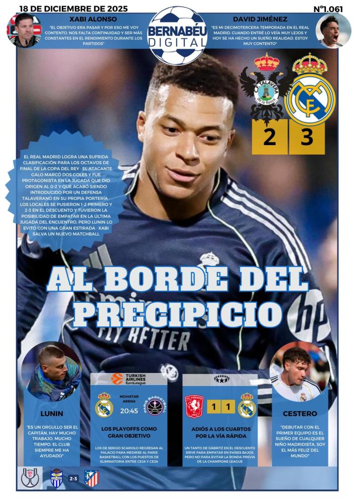 En la portada BD de este jueves destacamos la victoria del Real Madrid en Talavera de la Reina que sirve para que los de Xabi Alonso logren clasificarse para los octavos de final.