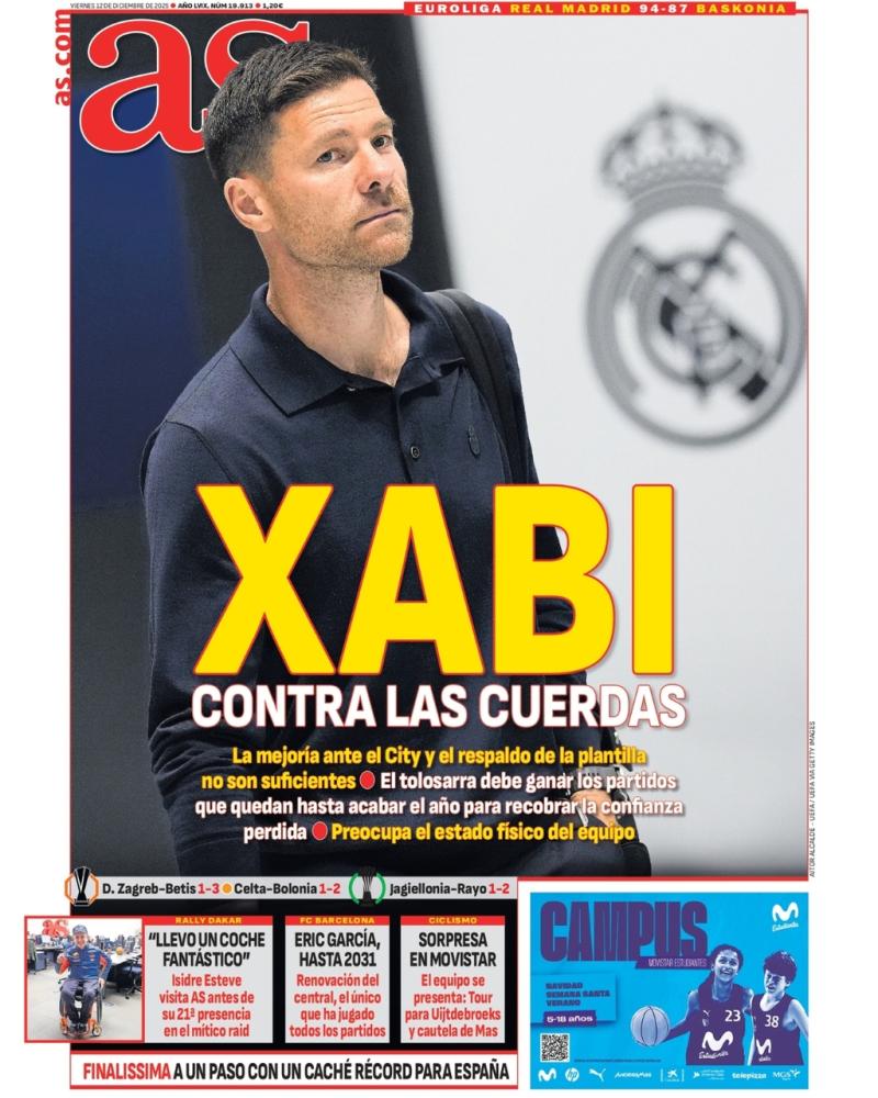 Para su portada del viernes, el diario AS se ha enfocado en el posible despido de Xabi Alonso como entrenador del Real Madrid.