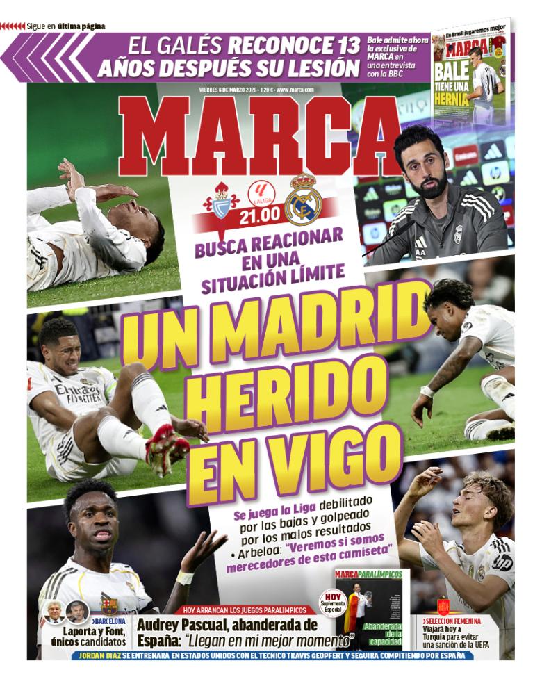 El diario Marca titula a toda página "Un Madrid herido en Vigo", ilustrando la situación que atraviesa el Real Madrid antes de su vital compromiso de esta noche. El rotativo destaca que la escuadra llega a este duelo muy debilitada por una severa plaga de bajas y fuertemente golpeada tras los últimos malos resultados cosechados. Además, recogen las palabras de Álvaro Arbeloa indicando que hoy se verá si son "merecedores de esta camiseta". En su franja superior, desvelan que Gareth Bale ha reconocido tener una hernia trece años después.