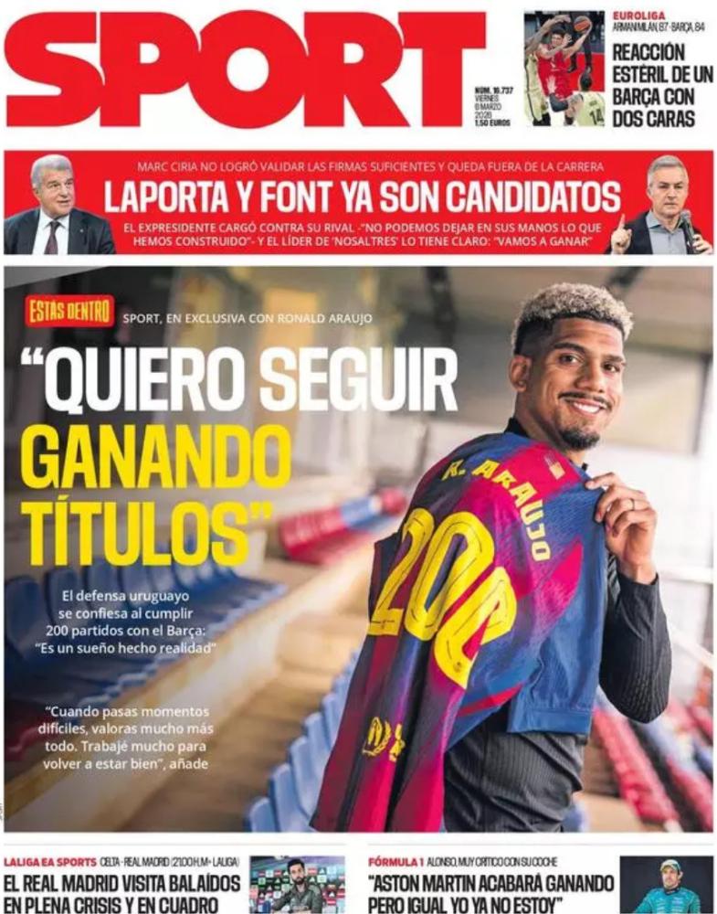 Finalmente, desde Cataluña, el Sport cede el protagonismo a Ronald Araujo bajo sus palabras de "Quiero seguir ganando títulos". A su vez, confirman que Laporta y Font ya son oficialmente candidatos a las elecciones presidenciales. Sin embargo, no quitan ojo a la actualidad del Real Madrid, resaltando que la expedición madridista "visita Balaídos en plena crisis y en cuadro".