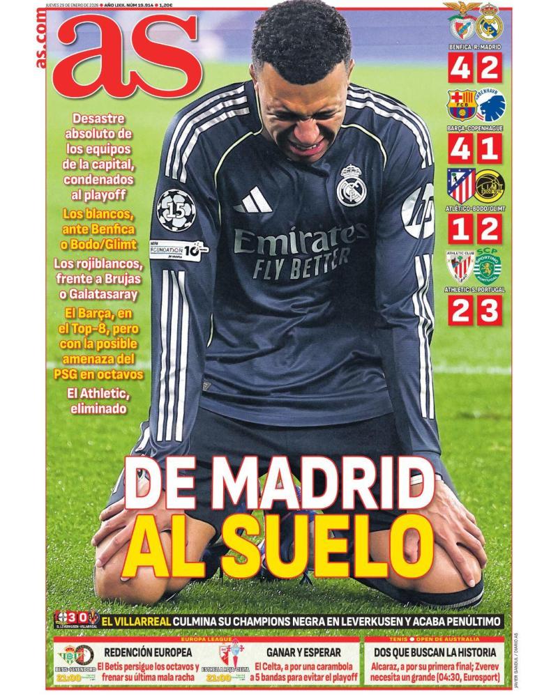 El Diario As titula ´De Madrid al suelo´ haciendo referencia al pinchazo de los blancos en Lisboa y al bajón anímico que ha supuesto perder un partido importante después del buen momento que atravesaba el equipo.