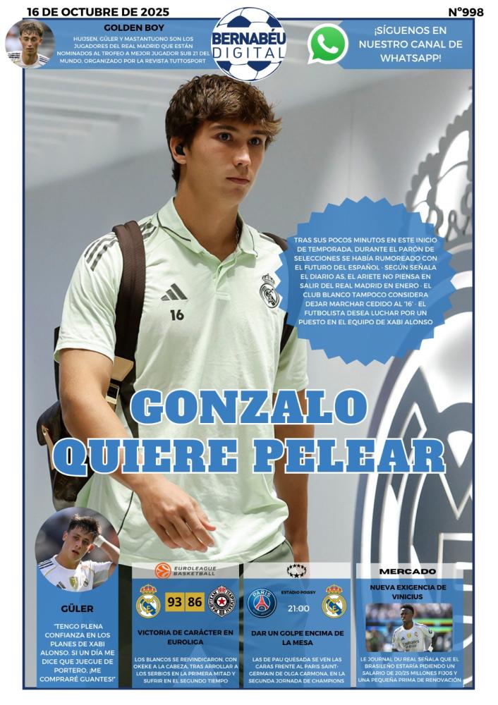 En nuestra portada del jueves 16 de octubre de 2025, en Bernabéu Digital hemos decidido abrir con la información del diario AS, según la cual ni Gonzalo ni el Real Madrid se plantean separar sus caminos en el mercado de invierno.
