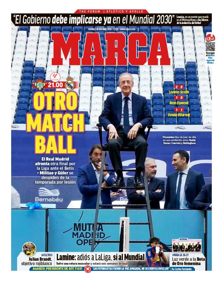 Marca destaca en su portada a Florentino Pérez en un Santiago Bernabéu transformado en pista de tenis y sentado cual juez de silla, metáfora que viene a la perfección con el Real Madrid, para el cual el partido de esta noche es vital ya que no puede fallar si quiere seguir en la pelea por la liga.