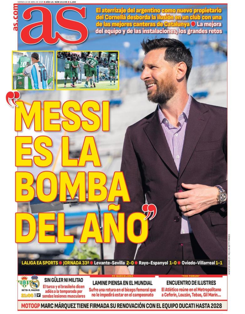 Por parte del AS, el diario saca en primera plana a Lionel Messi, quien se ha convertido en una revolución en Barcelona al haberse hecho con la compra del Cornellá, uno de los clubes con mejor cantera de toda Cataluña.
