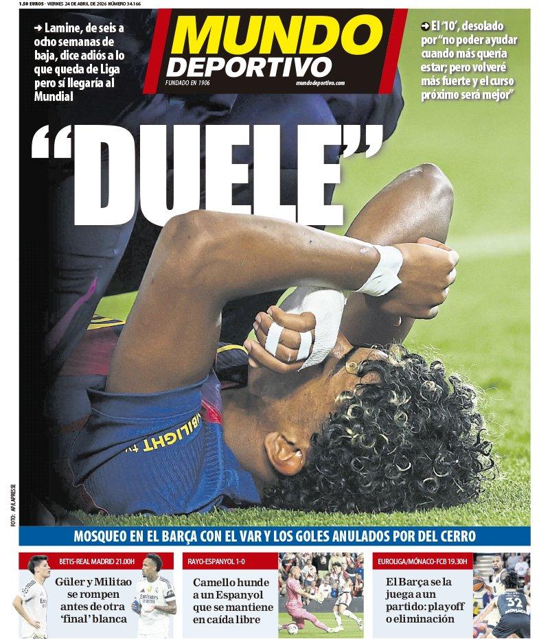 El Mundo Deportivo hace hincapié en primera página en el dolor que siente Lamine Yamal tras saber que su lesión le va a apartar de los terrenos de juego entre un mes y medio dos meses, peligrando también la convocatoria con España si no se recupera bien.