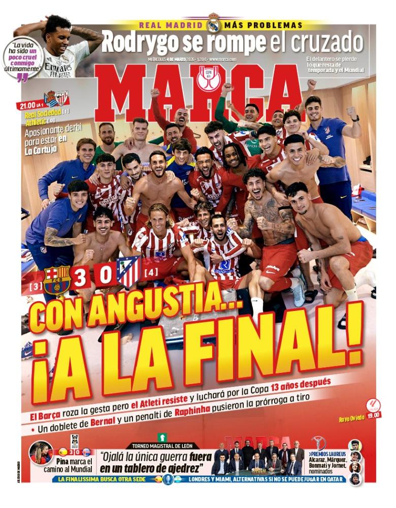 El diario Marca destaca el pase a la final del Atlético de Madrid, que ha perdido 3-0 contra el Barcelona, pero les ha valido para llegar hasta la última ronda de la Copa del Rey. También la lesión de Rodrygo Goes con el Real Madrid.
