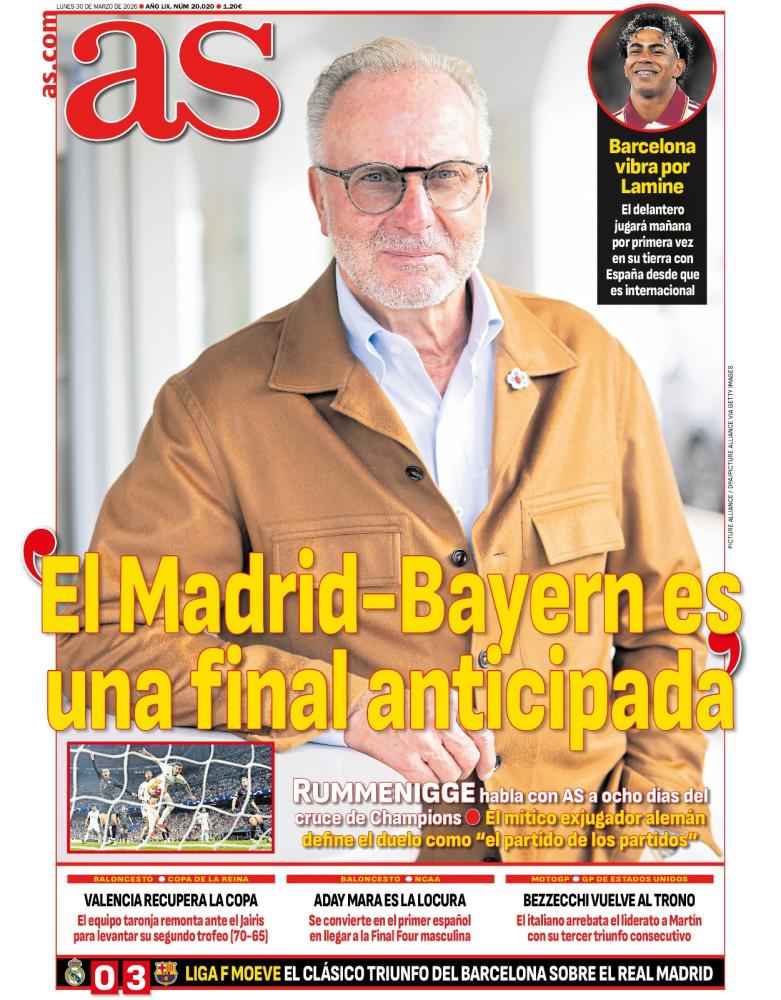 Por parte del AS, el diario saca en primera plana una fotografía de Rummenigge, presidente del Bayern Munich, el cual ha ofrecido una entrevista al medio para hablar de la próximia eliminatoria de la Champions League que les enfrenta con el Real Madrid