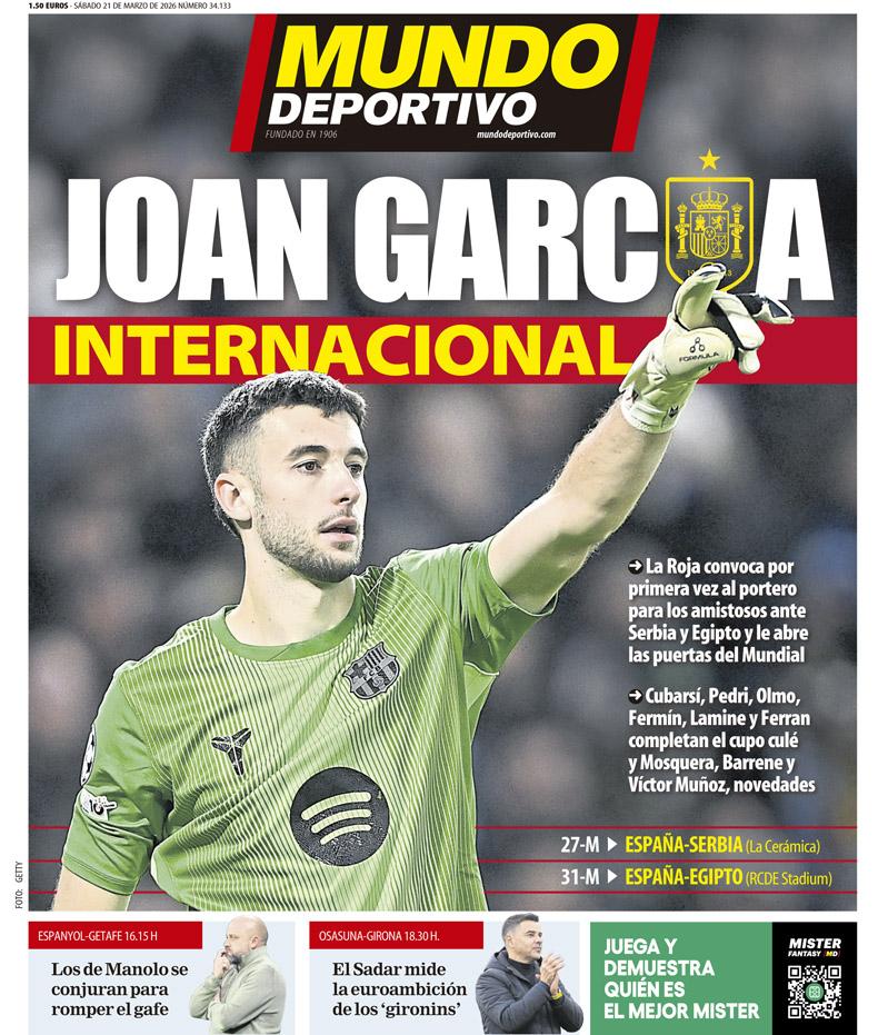 Por parte del AS, el diario saca en primera plana la importante convocatoria que ha conseguido Joan García por parte de Luis De La Fuente para poder acudir con los demás jugadores a la convocatoria de la selección.