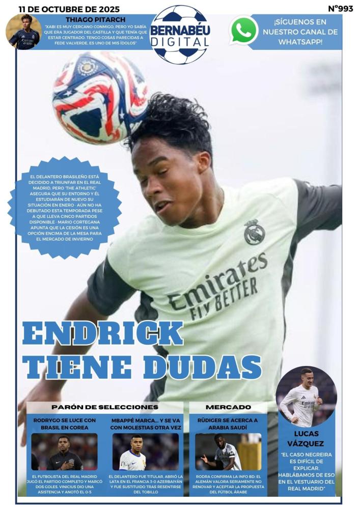 En nuestra portada del sábado 11 de octubre de 2025, en Bernabéu Digital hemos decidido abrir con el incierto futuro de Endrick. Y es que Mario Cortegana ha desvelado que la cesión es una opción para el mercado de invierno.