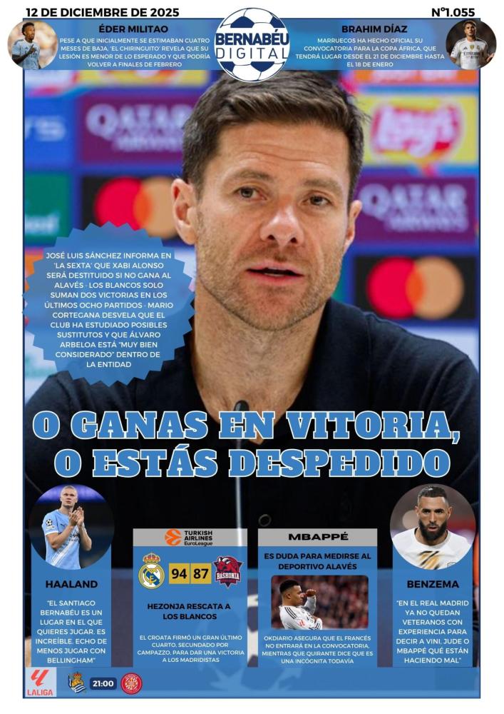En Bernabéu Digital hemos decidido abrir nuestra portada del viernes 12 de diciembre de 2025 con la decisión del Real Madrid de despedir a Xabi Alonso en caso de que los blancos no ganen al Alavés el domingo.