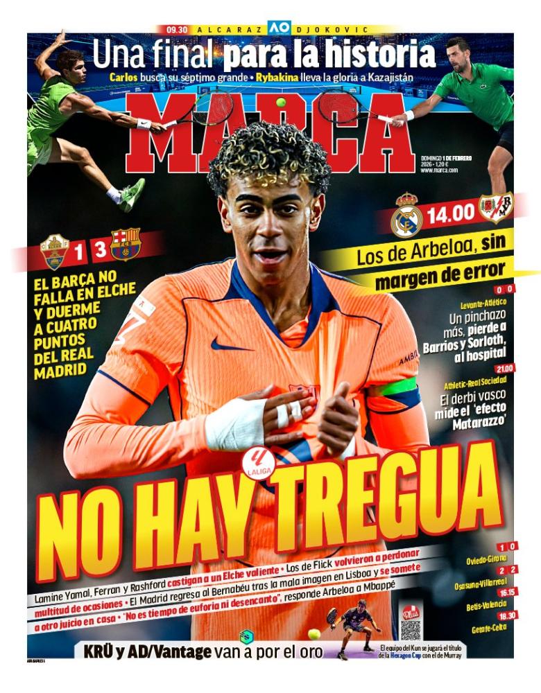 El diario Marca destaca la victoria del Barcelona en Elche, metiendo presión del Real Madrid, que jugará a las 14:00 de la tarde ante el Rayo en el Estadio Santiago Bernabéu.