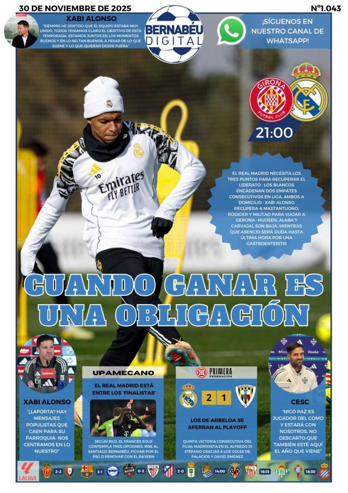 En nuestra portada del domingo 30 de noviembre de 2025, en Bernabéu Digital hemos decidido abrir con la previa del Girona - Real Madrid.