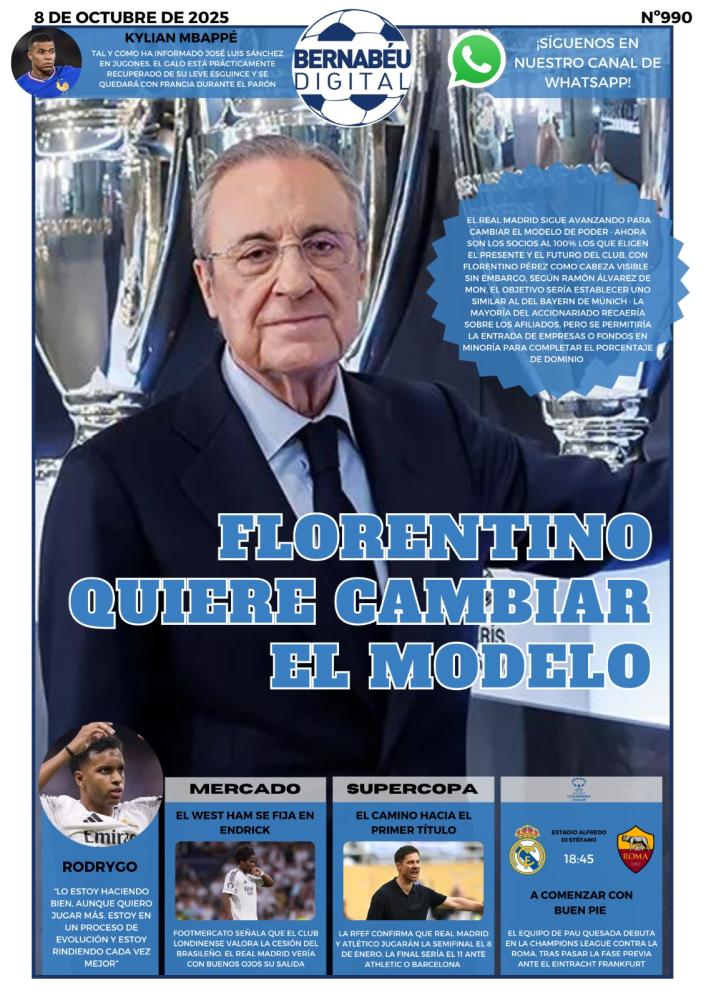 En nuestra portada del miércoles 8 de octubre de 2025, en Bernabéu Digital hemos decidido abrir con el cambio de modelo que podría efectuar el Real Madrid próximamente de acuerdo con la información compartida por Ramón Álvarez de Mon.