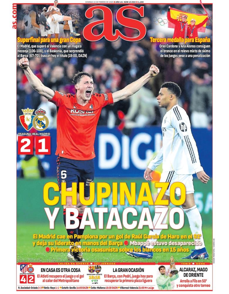 AS saca en primera plana la derrota del Real Madrid contra el Osasuna que pone contra las cuerdas el liderato si el Barcelona ganase su partido ante el Levante.