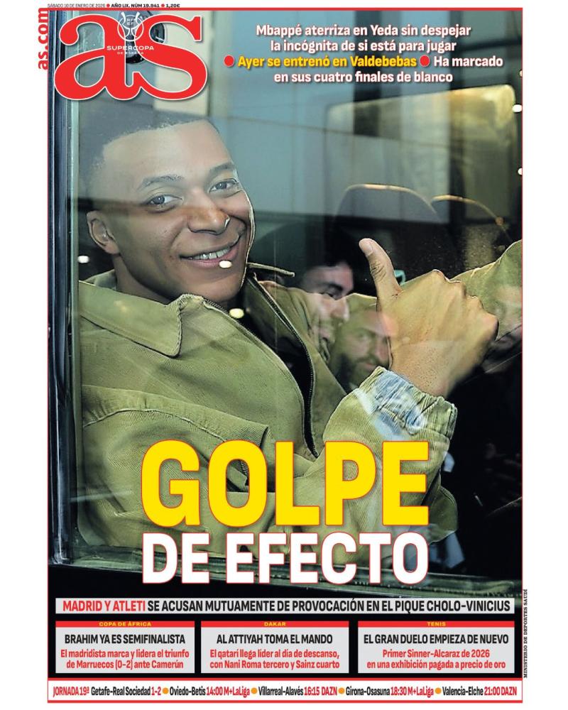 El AS saca en primera plana la vuelta de Kylian Mbappé a la rutina del Real Madrid, ya que tiene opciones de jugar la final de la Supercopa de España contra el Barcelona, aunque todo dependerá del estado físico de la rodilla y la decisión del equipo médico por si hay riesgo de recaída.