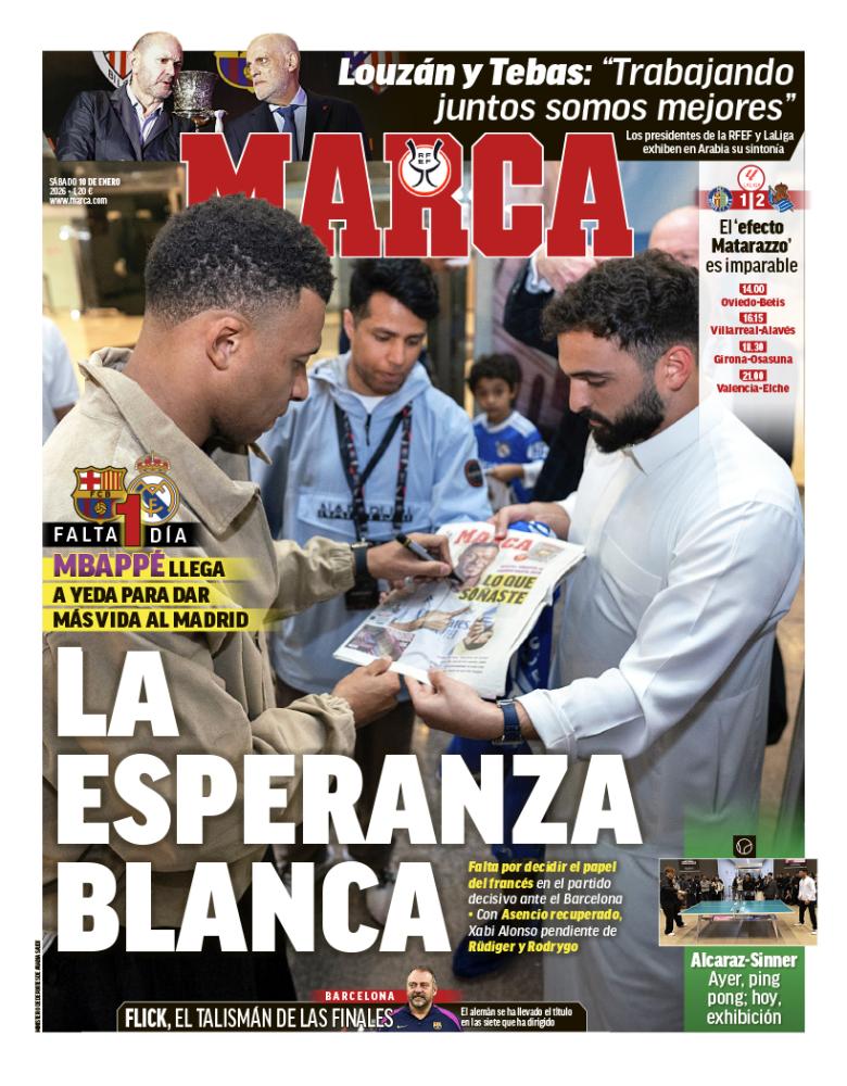 Marca también destaca a Kylian Mbappé, que aparece como la "esperanza blanca" para la final de la Supercopa de España de este domingo. El francés será duda hasta última hora, pero podría ser un refuerzo espectacular del Real Madrid.