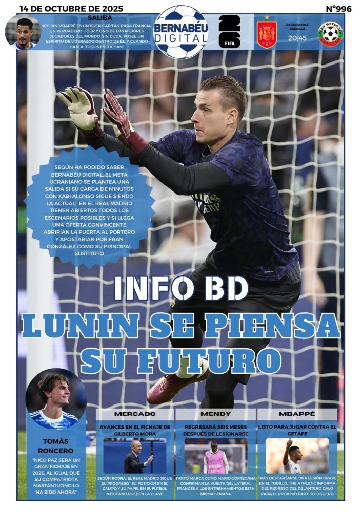 En la portada BD de este martes destacamos la posible salida de Lunin en caso de que siga sin contar con los minutos esperados. El Real Madrid baraja todos los escenarios posibles y, pese a que cuenta con el ucraniano, Fran González está en la recámara.